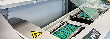 Mittels vollautomatischer Lötwellenanlage werden elektrische Leiterplatten weiterverarbeitet.